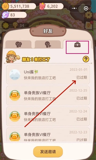 2、在这里点击第三个公文包的按钮,这里面会显示好友对你的打工邀请。