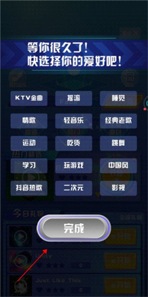 1、在本站下载安装进入到游戏后,选择自己爱好的音乐,选择完成后点击完成。