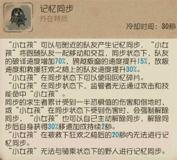 “小女孩”使用【记忆同步】可以辅助队友牵制监管者,可以选择携带【化险为夷】来分担救人位的救援压力。由于本身“小女孩”的牵制能力有限,因此携带【膝跳反射】可以增强自身的牵制能力。