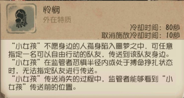 通过深入了解“小女孩”的技能和特点,并结合适当的天赋和策略,玩家可以在游戏中更好地发挥她的作用,为求生团队带来更多胜利的机会。