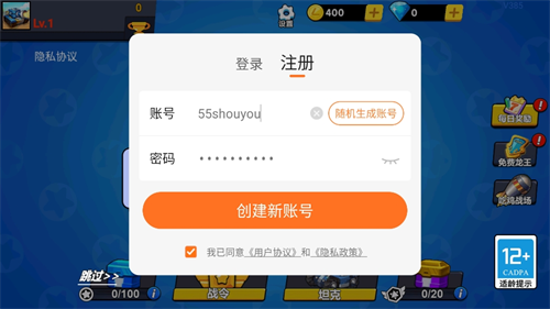 1、在本站下载游戏之后点击进入游戏,首次登录游戏需要先注册一下。