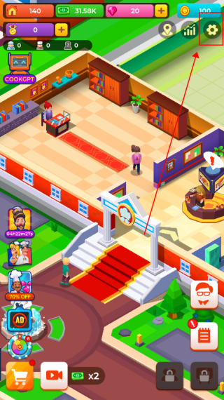1、首先在本站下载安装放置厨师学院游戏,进入游戏页面,点击右上角“设置”图标。