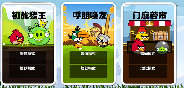 1、玩家们进入游戏之后,将能够选择各种不同类型的模式进行游玩,【初战猪王】模式会采用原版的关卡,但你能够获取到一些额外的能力,【呼朋唤友】模式之中会加入许多全新种类的小鸟,而【门庭若市】则可以让你通过商店来购买各种能力。