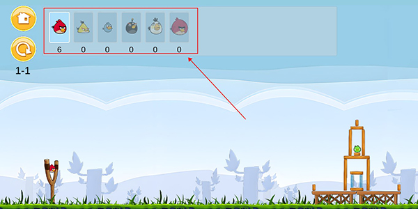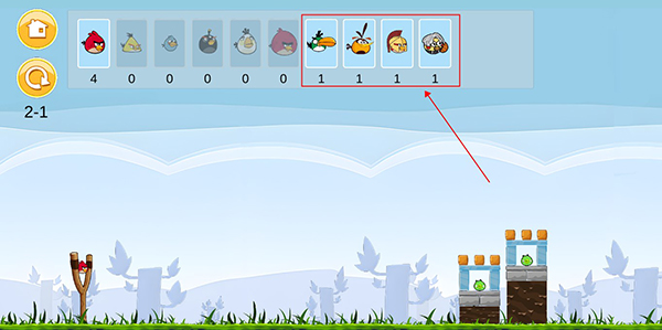 2、在关卡之中你将能够使用上方的各种小鸟来与捣蛋猪之间进行作战,每一种小鸟的能力都各不相同。