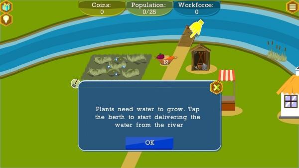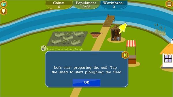 2、顶部的英文分别显示的是硬币、人口以及劳动力。跟随系统引导,点击棚子开始耕地播种。