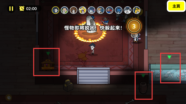 3、玩家需要不停变化位置避免被怪物抓到,将左上角时间耗尽即可通关。恐怖奶奶屠夫躺平躲猫猫游戏
