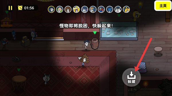 2、操控角色移动到选中的躲藏点后,点击屏幕出现的“躲藏”按钮,让角色隐藏起来。恐怖奶奶屠夫躺平躲猫猫游戏