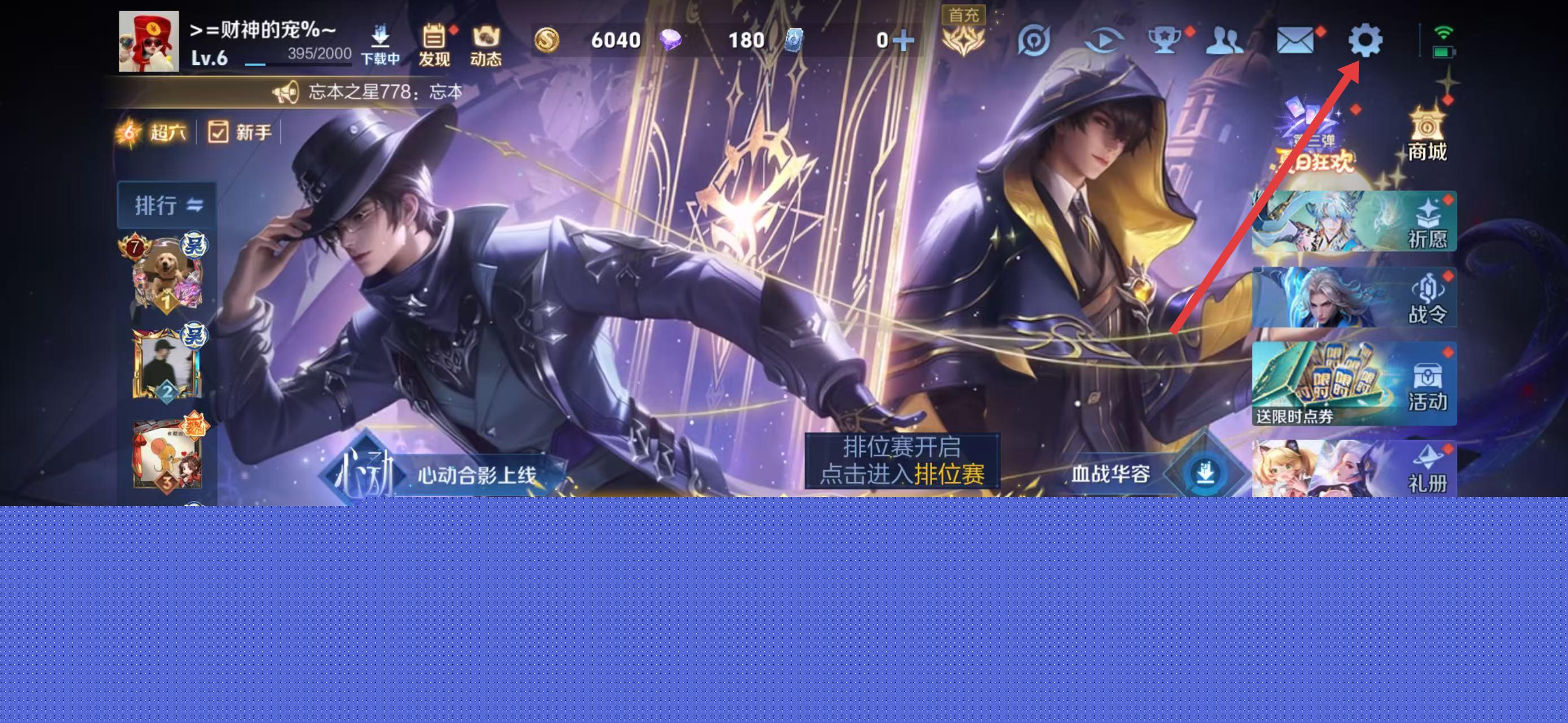 1、打开王者荣耀游戏,在游戏主界面点击右上角的设置图标,进入设置页面。