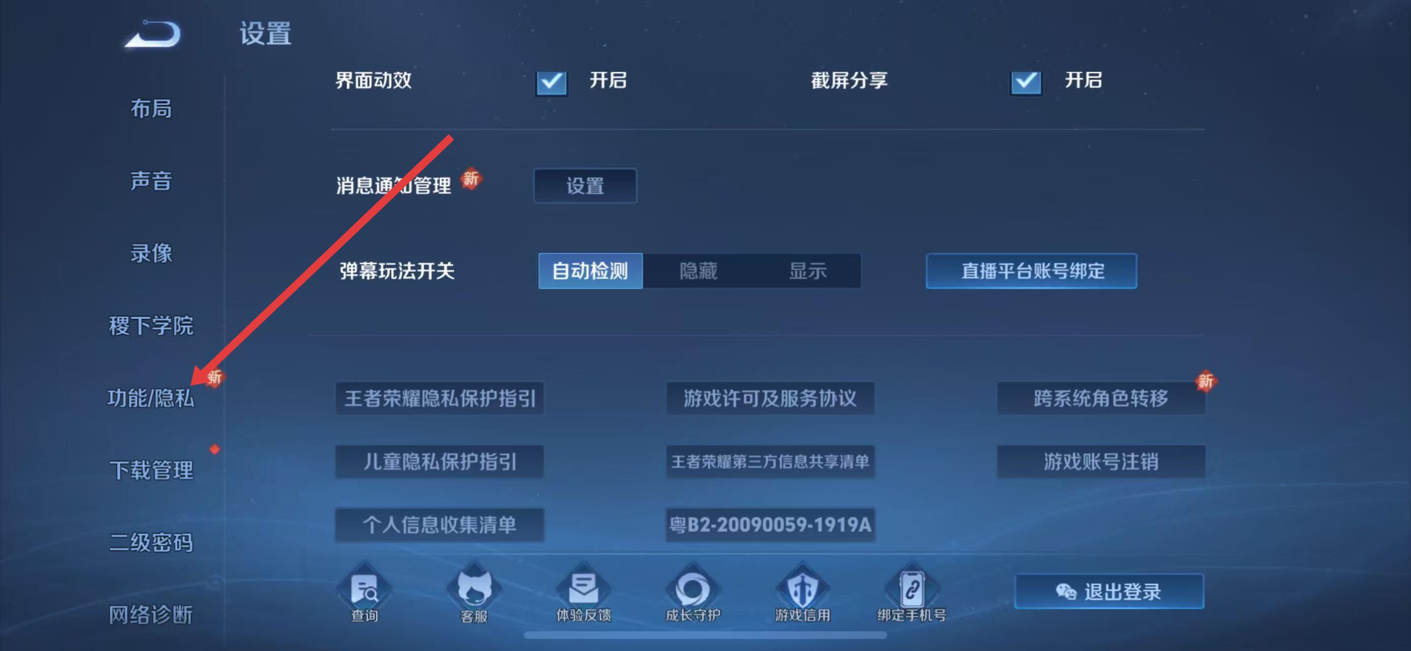 2、在设置页面中,点击左侧列表里的功能/隐私选项,进入功能隐私设置界面。
