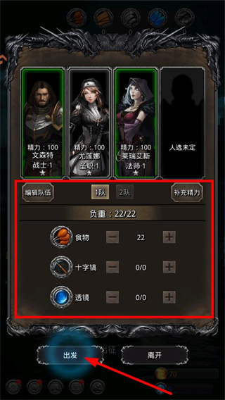 4、点击出征按钮后,编辑选择角色加入队伍,配置食物等物资,点击出发,即可开启探索或战斗流程。