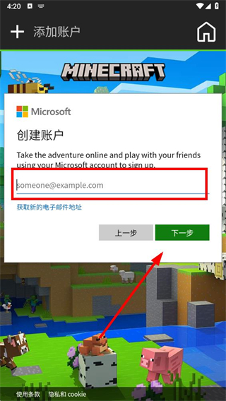4、在创建账户界面的输入框中,填写电子邮箱地址,之后点击下一步按钮,继续完成账号注册的后续流程。