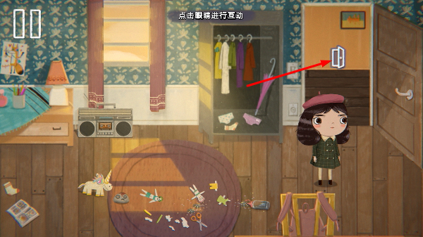 2、房间场景里按提示【点击眼睛进行行动】,找门图标区域,触发后续的互动流程。