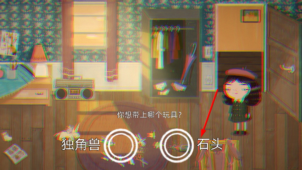 3、触发选择界面后遇【你想带上哪个玩具?】提问,在【独角兽】【石头】里选其一携带。
