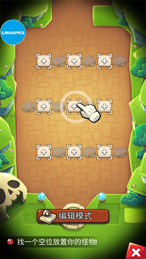 2、进入编辑模式后,选择路径上的空位(带【+】标识),准备放置新怪物,优化防御布局。