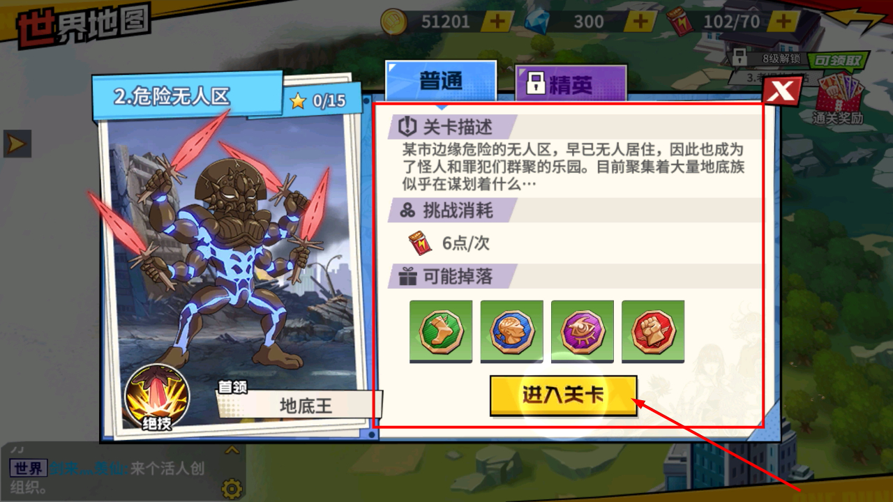 2、进入【危险无人区】关卡前,注意每次挑战消耗【6点】体力,可能掉落道具,点击进入挑战。
