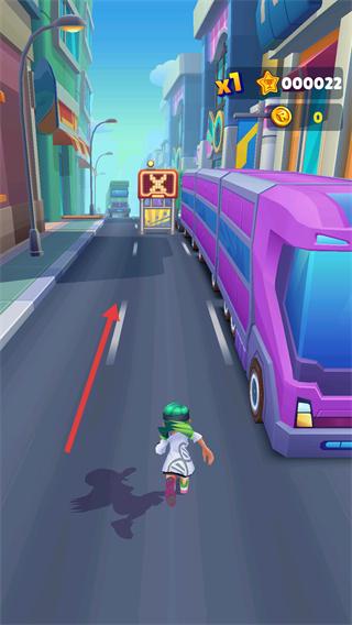 2、进入跑酷场景后,操控角色向前移动,避开【紫色大巴】,同时收集【000022】积分,推进跑酷进程。