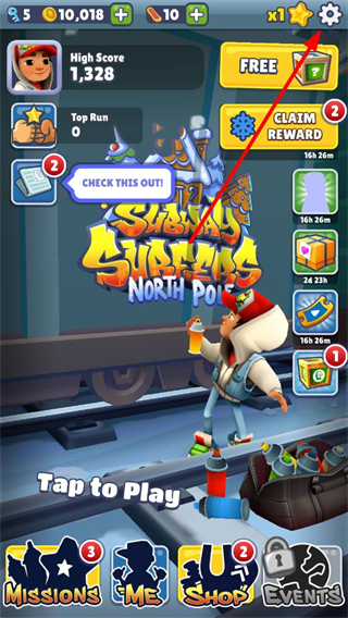 1、进入地铁跑酷主界面,找到右上角齿轮样式的设置选项并点击,打开设置界面。