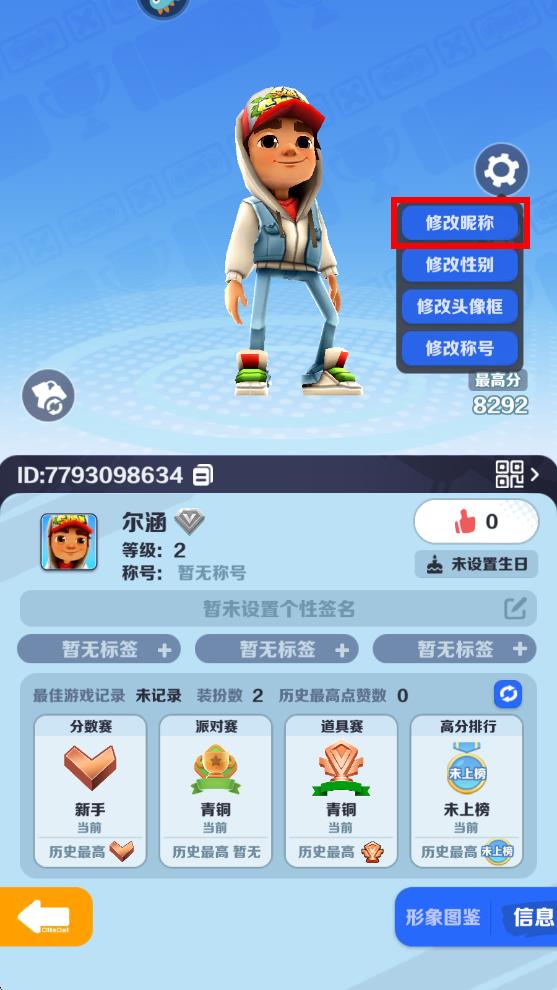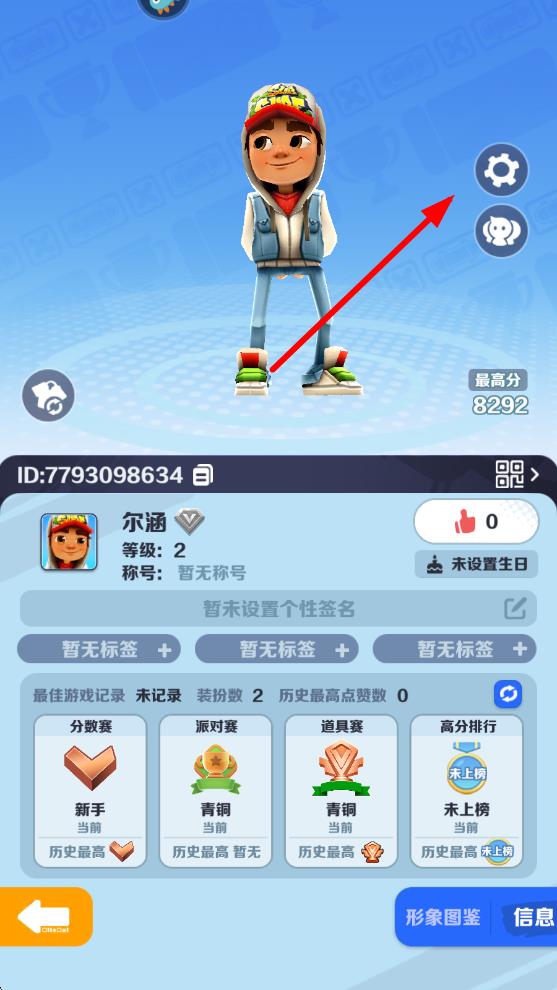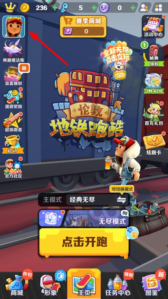 1、进入地铁跑酷主界面后,点击左上角的个人头像,进入个人信息页面。