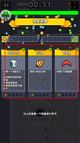 1、游戏的主要玩法就是控制角色进行左右移动走位,躲避掉所有的攻击,选择天赋异能。