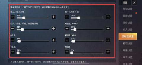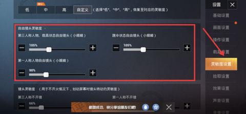 2、在镜头灵敏度区域,调整第三人称/第一人称的镜头移动、开火镜头等灵敏度滑块。