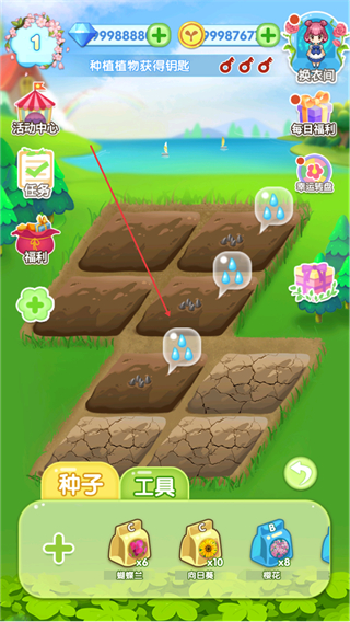 1、在花园界面,点击土地上的水滴图标,进行浇水操作,培育植物。