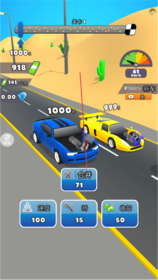 2、继续合并车辆,提升汽车价值,同时收集道路上的道具,增加收益数值。