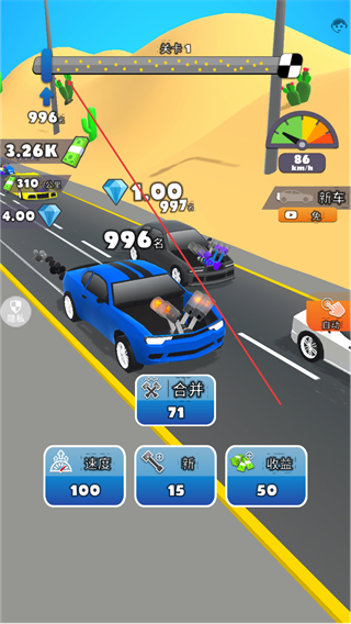 1、在赛道中操控汽车,点击合并按钮融合车辆,提升汽车等级,积累收益。