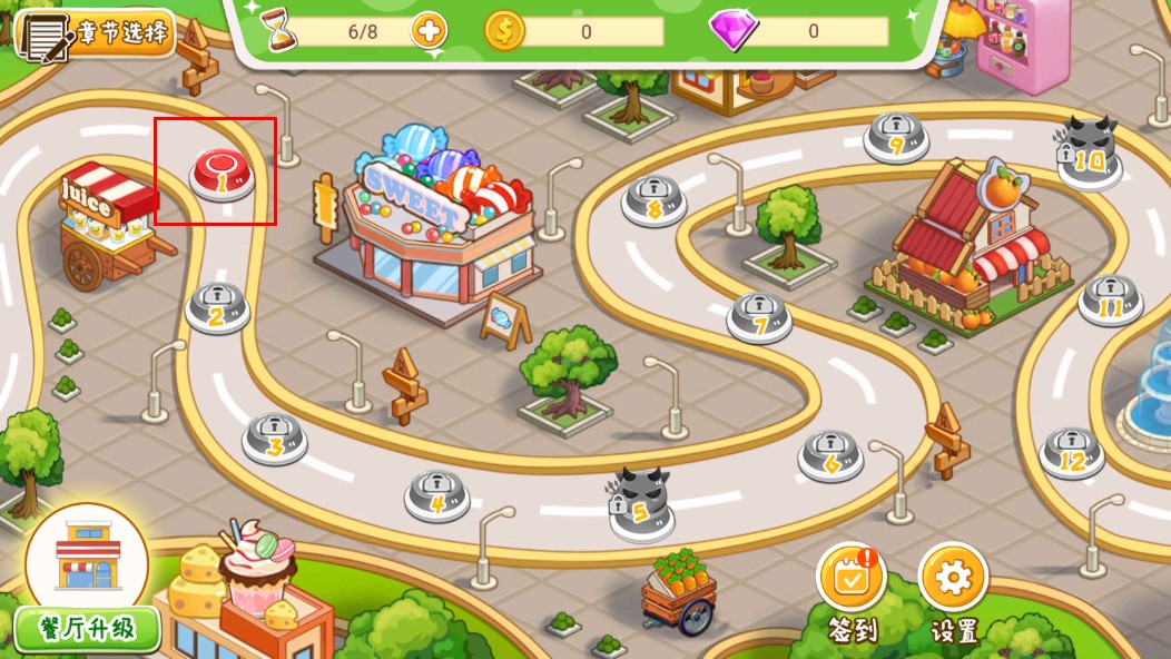 1、在关卡选择界面,点击带有数字“1”的红色按钮,进入第1关游戏。