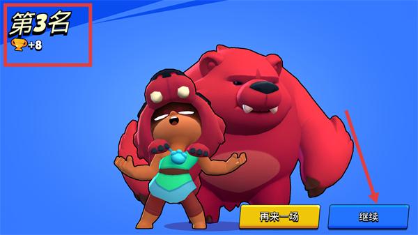 4、结算界面显示【第3名】,可点击【再来一场】重试对局,或点【继续】领取当前对局的奖励。