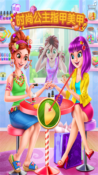 1、在【时尚公主指甲美甲】主界面,点击中间的播放按钮,即可进入美甲功能选择的建筑页面。