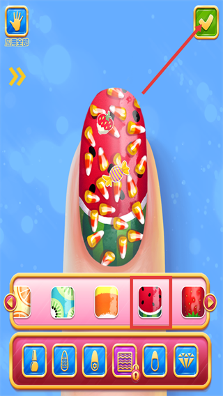 4、完成美甲装饰后,点击右上角的对勾按钮,可确认当前美甲设计并完成该环节的操作。