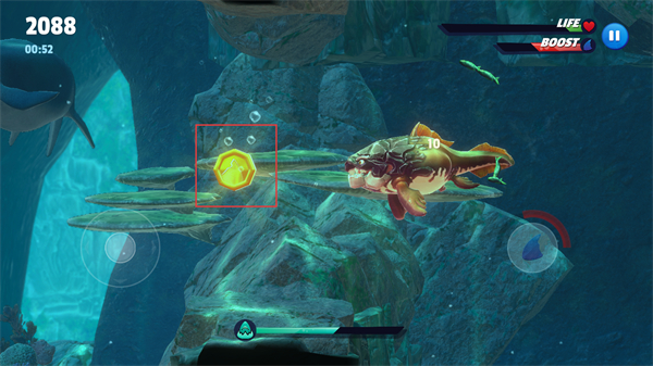 3、靠近发光的绿色道具区域,捕食聚集的鱼类,快速获取资源并推进游戏进度。