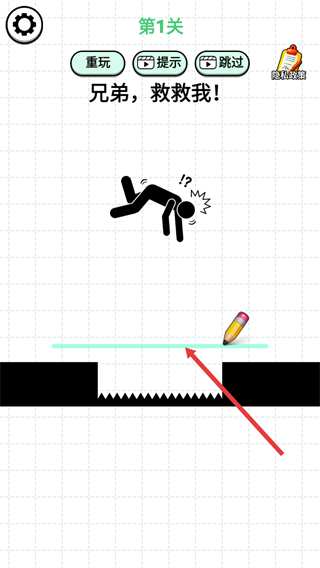 2、进入【第1关】后,根据提示用铅笔工具绘制路径,帮助角色避开危险(如尖刺),完成关卡目标。