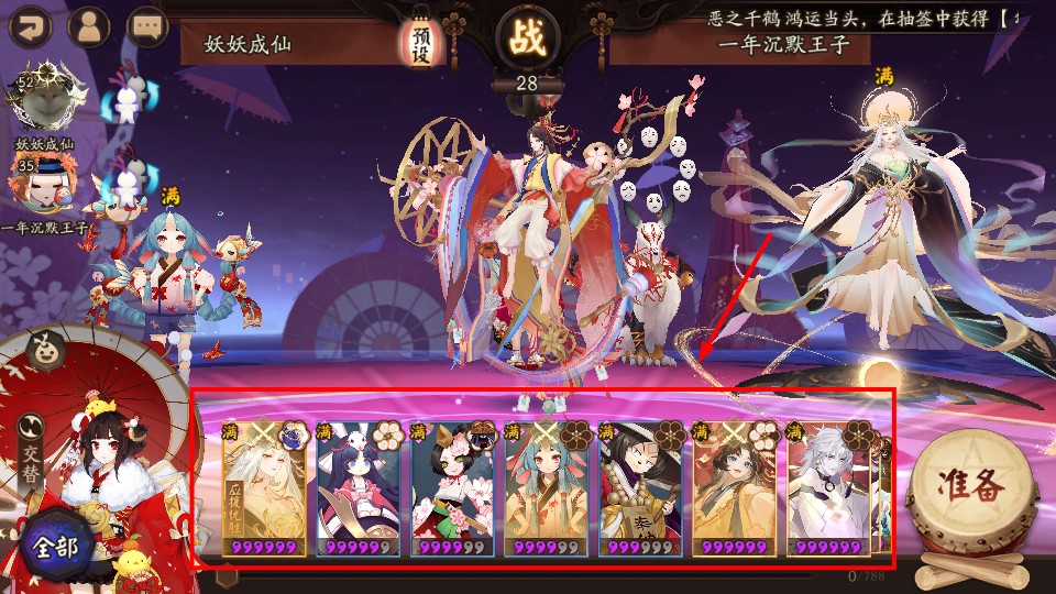 2、战斗准备阶段检查式神卡牌是否齐全,确认每张式神状态为【满】,点击【准备】按钮进入战斗流程。