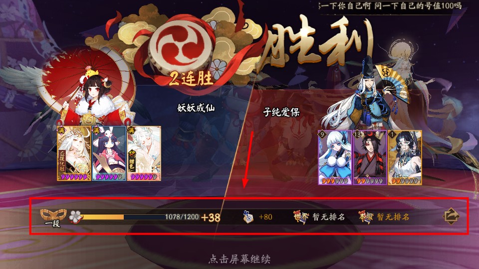 4、战斗胜利后查看段位积分变化,如【一段】积分增加数值,点击屏幕继续后续对战或结算流程。