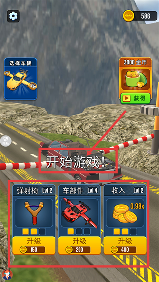 1、进入游戏后先选择合适车辆,升级【弹射椅】【车部件】【收入】等提升性能,再点击开始游戏开启挑战。