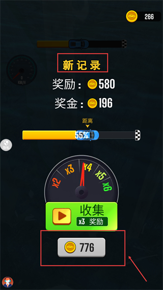 4、闯关结束后查看奖励界面,点击收集获取金币,积累的资源可用于后续车辆部件升级。