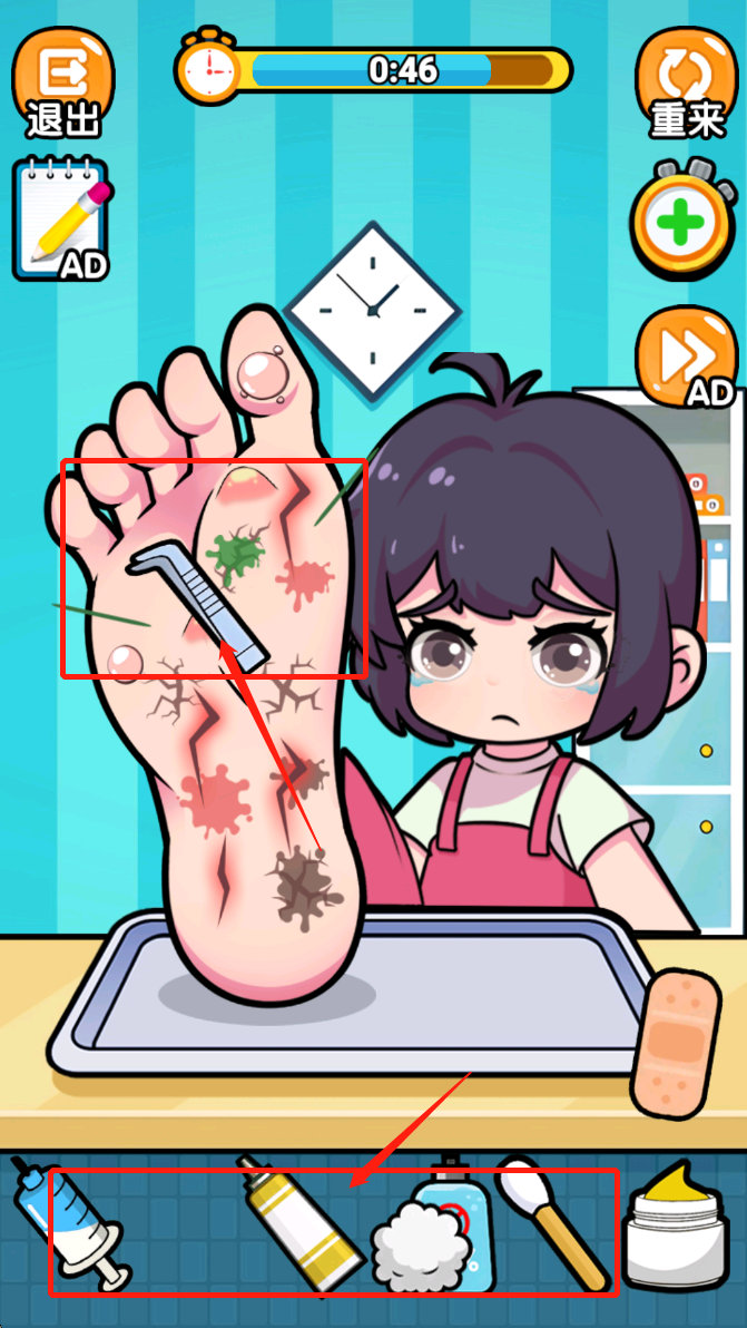1、查看脚部情况:进入关卡后,玩家需要仔细检查脚部的病情,了解具体问题。