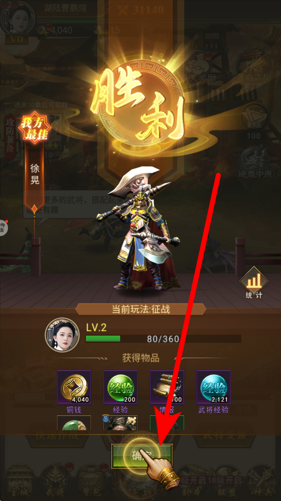 4、获取胜利奖励,成功击败敌人后,可获得铜钱、经验等胜利奖励,这些奖励能助力角色与武将的成长,为后续征战提供支持。