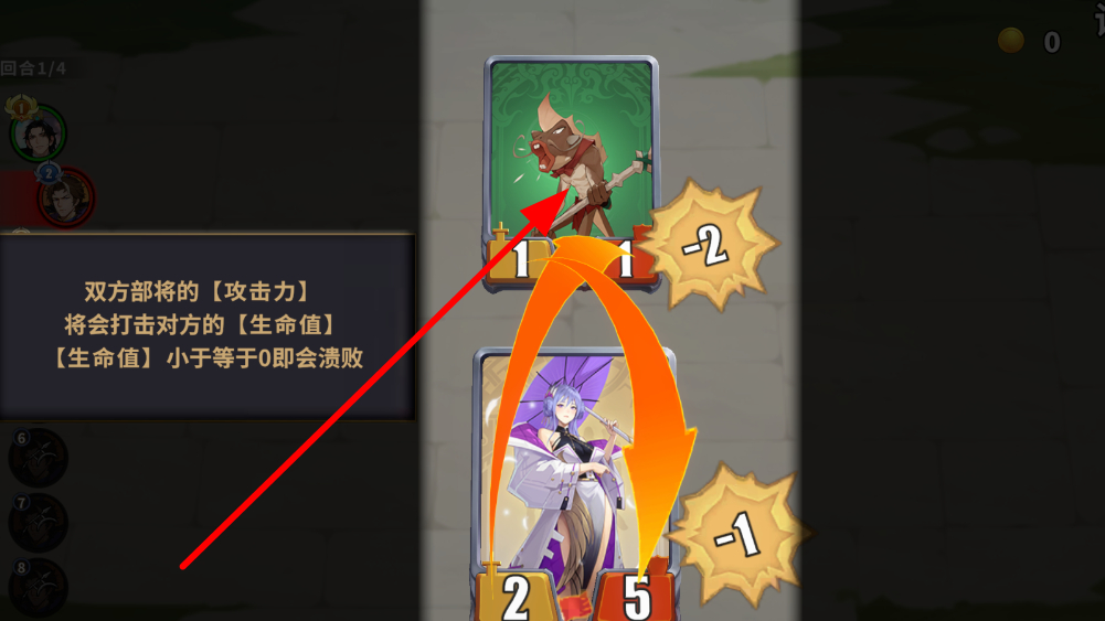 4、双方部将的攻击力会打击对方的生命值,某一方部将的生命值小于等于0时,该部将就会溃败,需合理运用卡牌,通过机制击败对手。