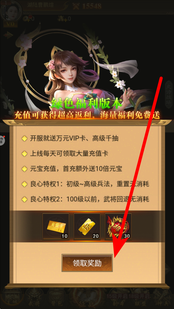 2、然后领取版本福利,在绿色福利版本相关界面,可领取开服送的万元VIP卡、高级千抽等奖励,这些福利能为后续游戏提供助力。