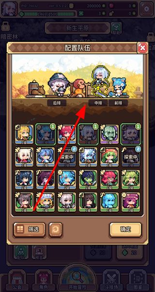 1、配置队伍界面选择角色,按后排中排前排的位置安排队员,调整好阵容后点击确定,完成队伍配置。