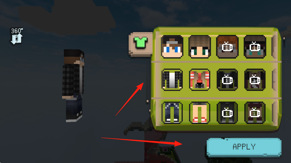 2、进入角色装扮界面,可在绿色的服装选择框中,按红色箭头指示选择喜欢的角色外观,选择完成后点击【APPLY】按钮应用装扮。