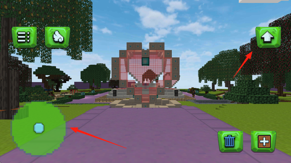 3、进入游戏场景后,通过屏幕上的绿色按钮操控角色,左下角圆形按钮控制角色移动,右上角向上箭头按钮可能用于跳跃等动作。