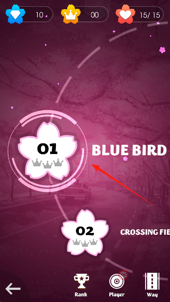 2、在关卡选择界面,看到关卡以花朵形状图标呈现,关卡01名称为“BLUEBIRD”,按照红色箭头指示,点击该关卡图标进入游戏。