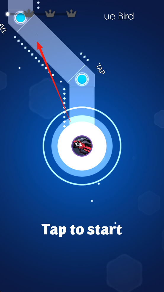 3、进入游戏后,根据提示“Taptostart”点击屏幕开始,游戏中需按照红色箭头指示,点击屏幕操控游戏元素移动,跟随音乐节奏,完成关卡挑战。