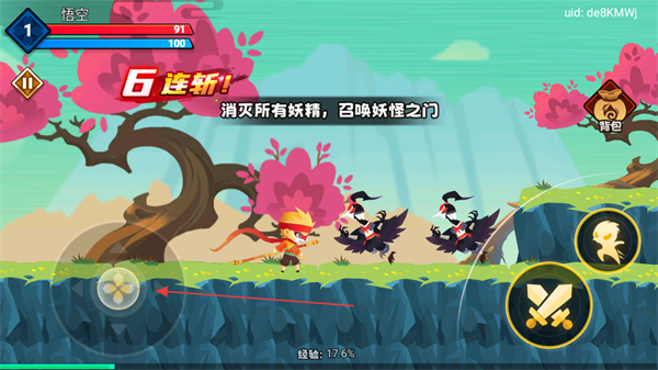 1、操控左侧移动键控制悟空移动,攻击妖精触发6连斩!,推进消灭妖精的进度。