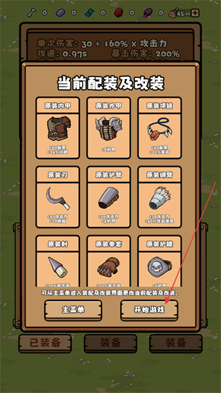 1、查看当前配装及改装界面,确认装备后点击开始游戏进入关卡。