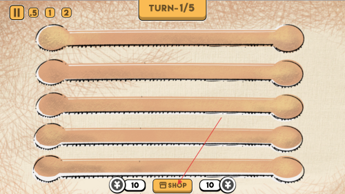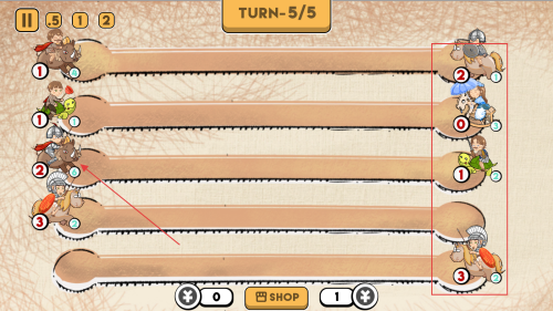 2、对局开始后,界面显示【TURN-1/5】,此时可利用下方【SHOP】等功能,为后续回合做准备。