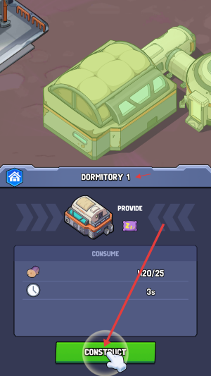 3、要建造宿舍,查看所需资源,确保满足【120/25】木材等消耗,点击【CONSTRUCT】按钮,开始建造。